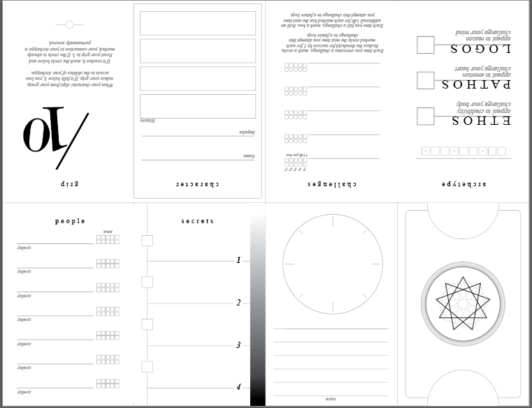 honk honk I put some real actual thought into AGAIN, my time loop game that, in retrospect, I’ve been working on in some form since like 2012 (with a decade-long break in the middle). It’s not quite ready for playtesting, but I’m hoping to get it there “soon,” which is to say, sometime in the next 2-3 months. In the meantime, this is what the front of the character sheet looks like in its current form (it’s a one-page zine that you fold and cut in the center, like so):