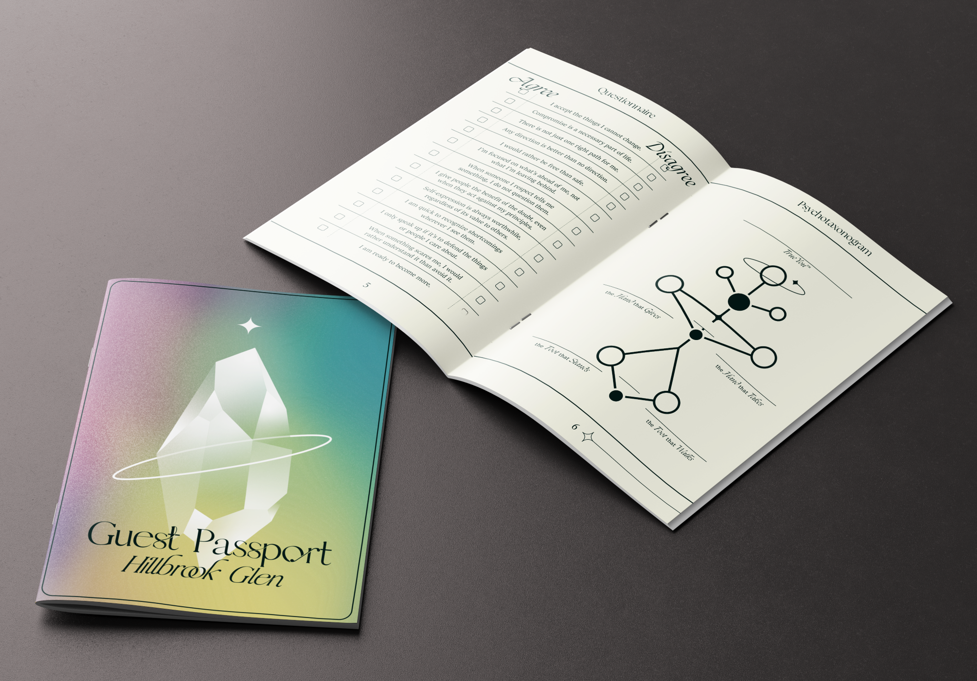 I’m working through layout on components for Hillbrook Glen—specifically, a small-format (A6) character booklet you’ll be able to use throughout the course of a “wellness retreat.”